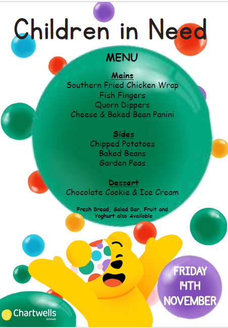 As your child currently brings a packed lunch into school, we would like to take this opportunity to invite them to join us for this year’s Children in Need Lunch on Friday 14th November 2025.