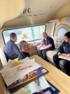 We have a caravan on site to provide a quiet, dry place for children to read, talk and play table top games, developing their reading, social and turn taking skills.